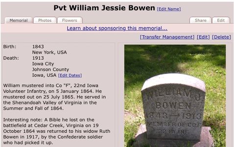 Findagrave.com allows contributors to create memorials for individuals on the site, with photos and text. More than 800 memorials for 22nd Iowa soldiers have been aggregated in a Find A Grave "virtual cemetery," which can be accessed at: